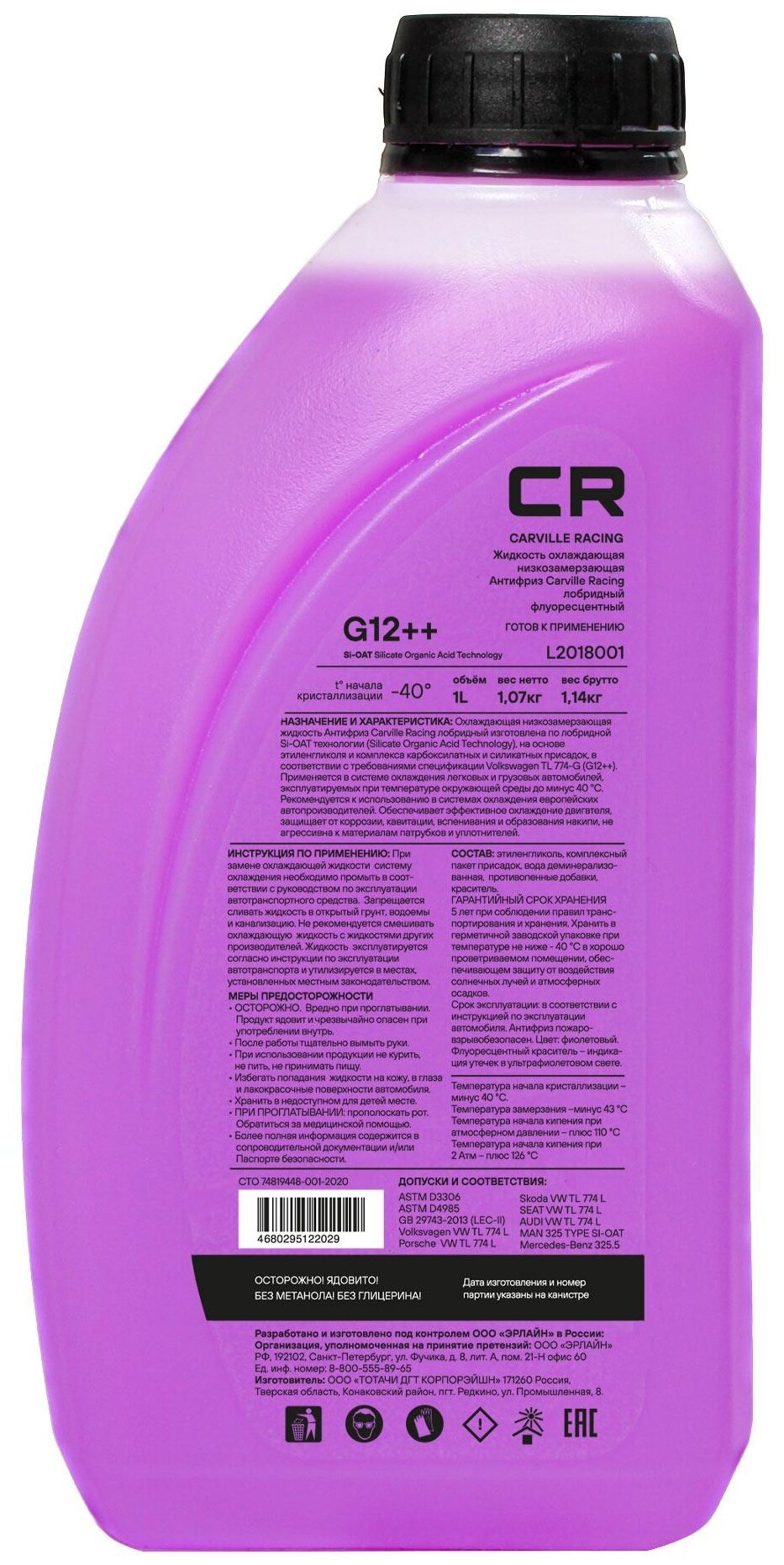 Антифриз, Готовый Раствор Cr G12++, Лобридный Флуор. -40°С, Фиолет, 1Л/1.07Кг Carville Racing арт. L2018001