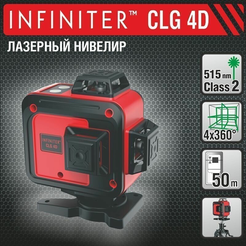 Нивелир лазерный INFINITER CLG 4D, 1-2-295 4 линии 360, диапазон до 50м, ±3°, точность 3мм/10м, резьба 1/4" и 5/8", АКБ 3.7В 4000мАч Li-Ion, 0,85кг, очки, сумка CONDTROL интересное: