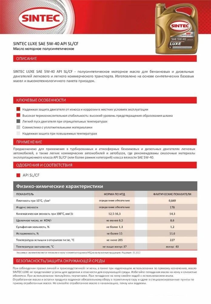 масло sintec 5w40 luxe 5000 api sl/cf 4л п/с 801933/600237