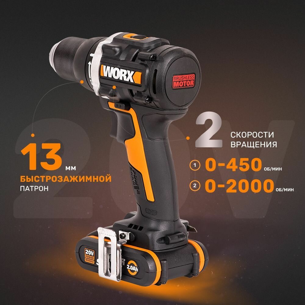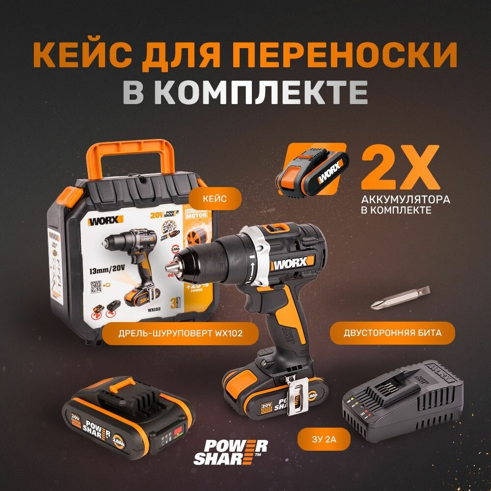Аккумуляторная дрель-шуруповерт с бесщеточным мотором Worx WX102, 20 В, 60 Нм, 2 АКБ по 2 Ач + ЗУ 2А, кейс
