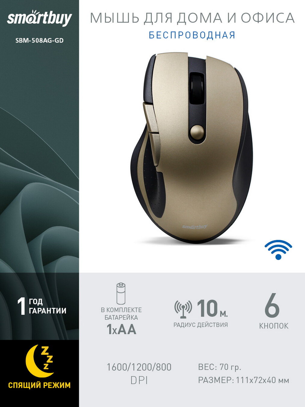 SmartBuy Wireless Optical Mouse (sbm-508ag-gd) (rtl) USB 6btn+Roll, беспроводная .