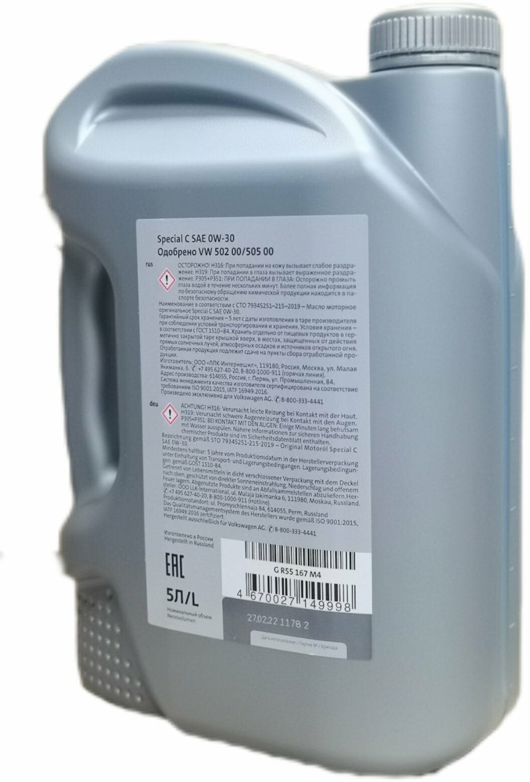 Моторное масло VAG SPECIAL С 0W-30 GR55167M4/ G055167M4 5 л Volkswagen, Skoda, Audi Синтетическое
