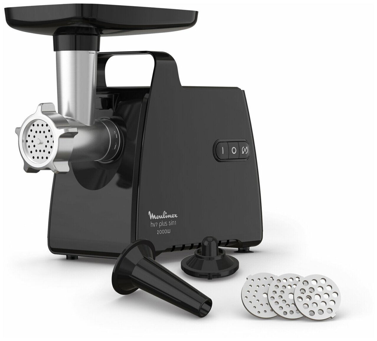Мясорубка Moulinex HV7 Plus ME552810 с реверсом, 2000 Вт, 2.8 кг/мин, 3 решетки, насадки для кеббе и сосисок, черная