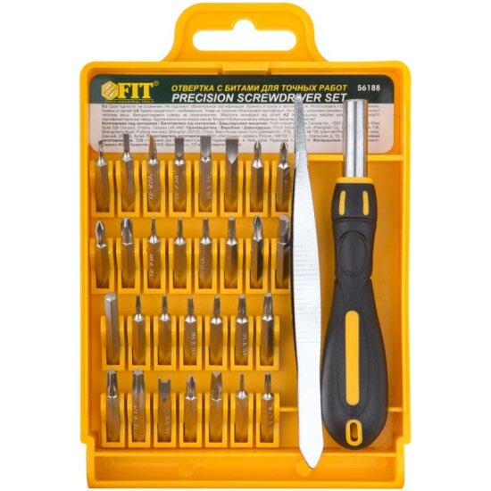 Отвертка с битами для точных работ, 30 CrV бит, пинцет, в пластиковом футляре FIT 56188