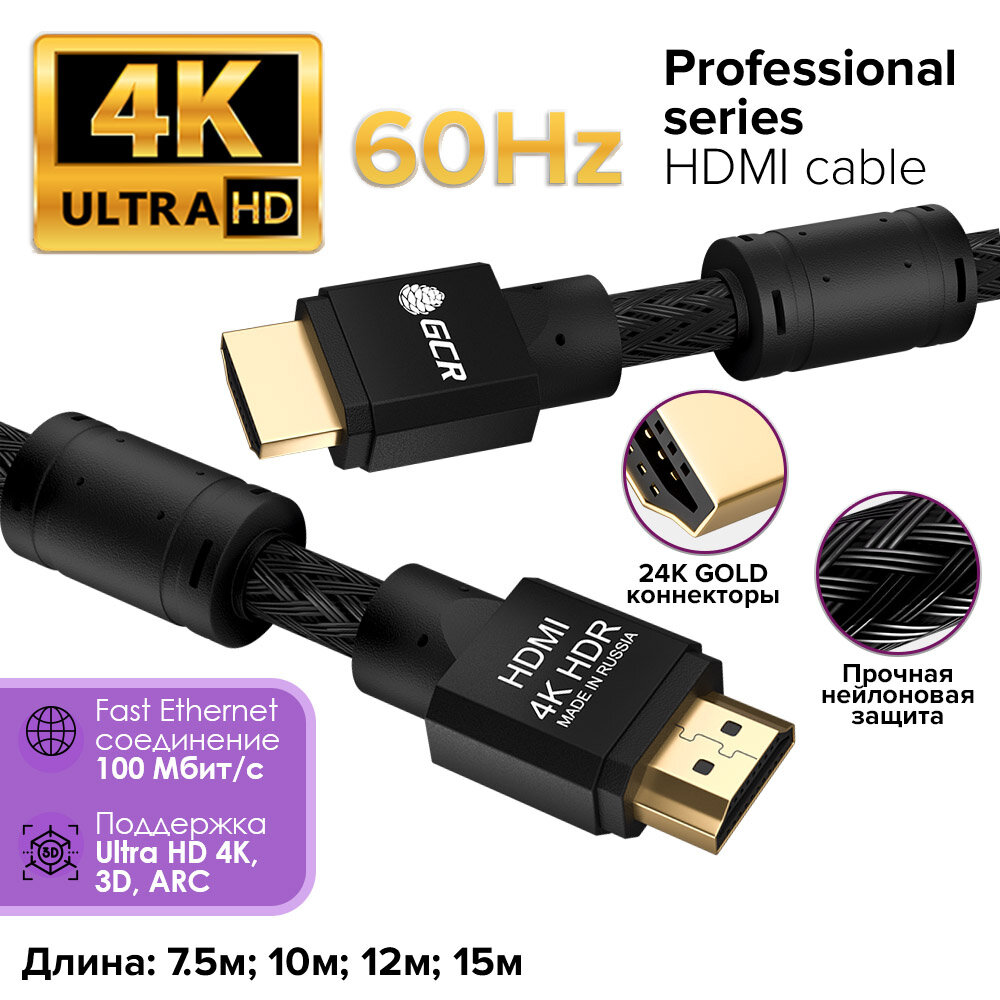 HDMI кабель длинный 12м GCR Ultra HD 4K 3D 18 Гбит/с частично нейлон 24K GOLD черный с ферритовыми кольцами