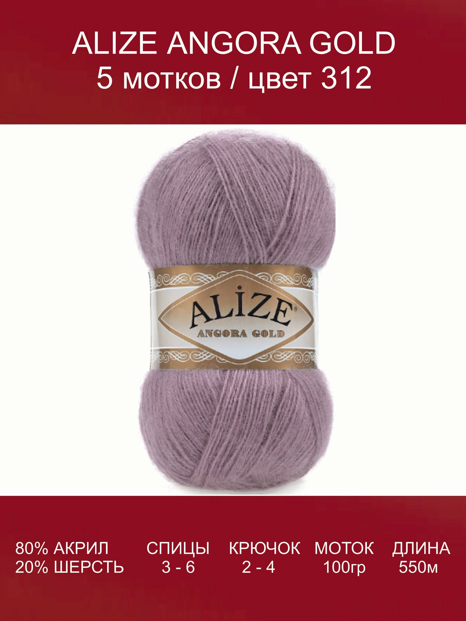 Пряжа для вязания ALIZE 'Angora Gold', 100г, 550м (80% акрил, 20% шерсть), ТУ (163 серая роза), 5 мотков