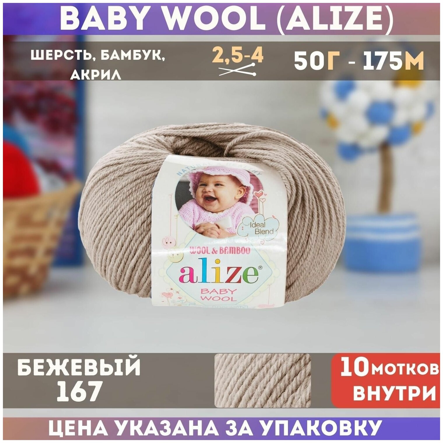 Купить Пряжа для вязания ALIZE 'Baby wool' 50гр. 175м. (20%бамбук, 40%шерсть, 40%акрил)ТУ (167 бежевый), 10 мотков