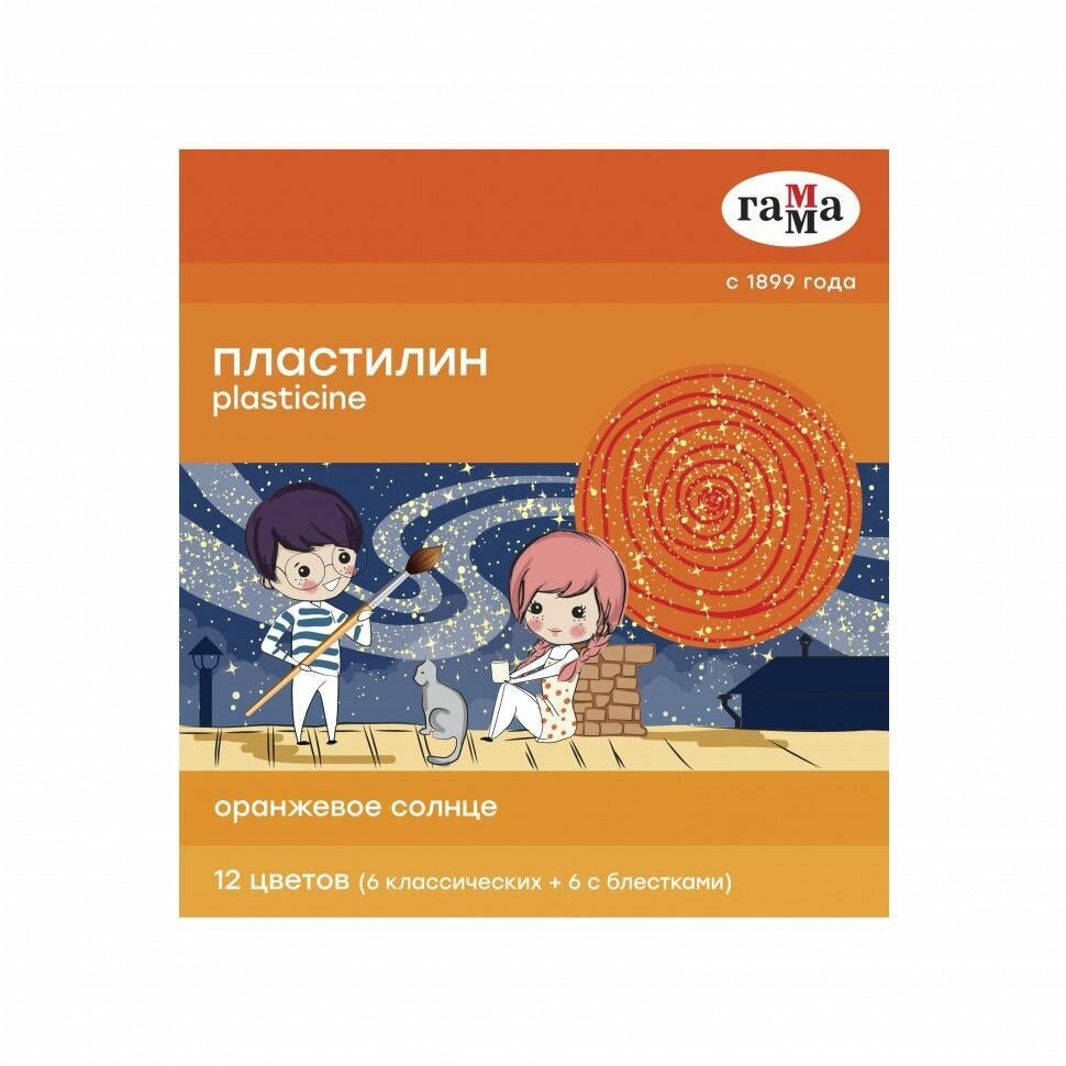 Пластилин 12 цветов 168 г (6 классических, 6 с блёстками) "Гамма" "Оранжевое солнце", со стеком