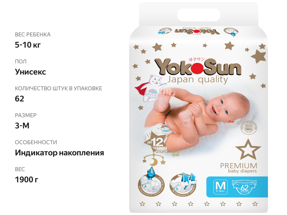 Подгузники YokoSun Premium M (5-10 кг) 62 шт . интересное: