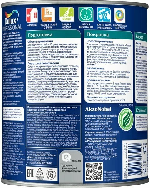 Dulux Фасадная Гладкая краска для минеральных поверхностей, Баз BW 1л 5255345 .