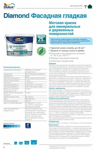 DULUX Diamond Фасадная гладкая база BW белая краска акриловая (2,5л) / DULUX Diamond Фасадная гладкая base BW краска акриловая влагостойкая матовая (2