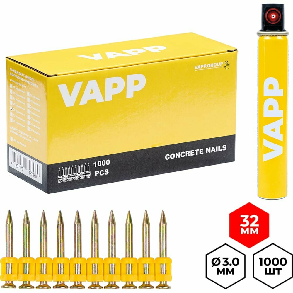 VAPP Гвозди по бетону 27x3 мм усиленные для монтажного пистолета с газовым баллоном 165 мм VAPP.G-CN327