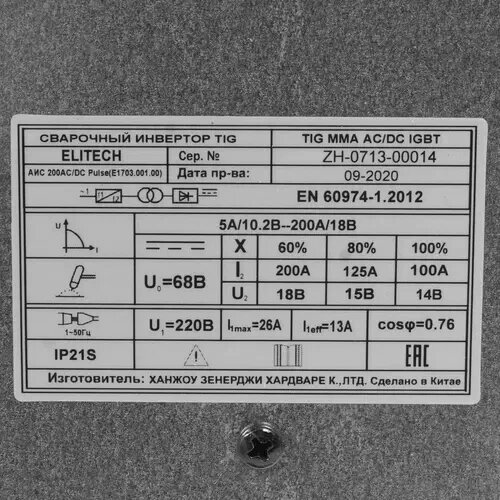 Инвертор свар. TIG АИС 200 AC/DC Pulse ELITECH