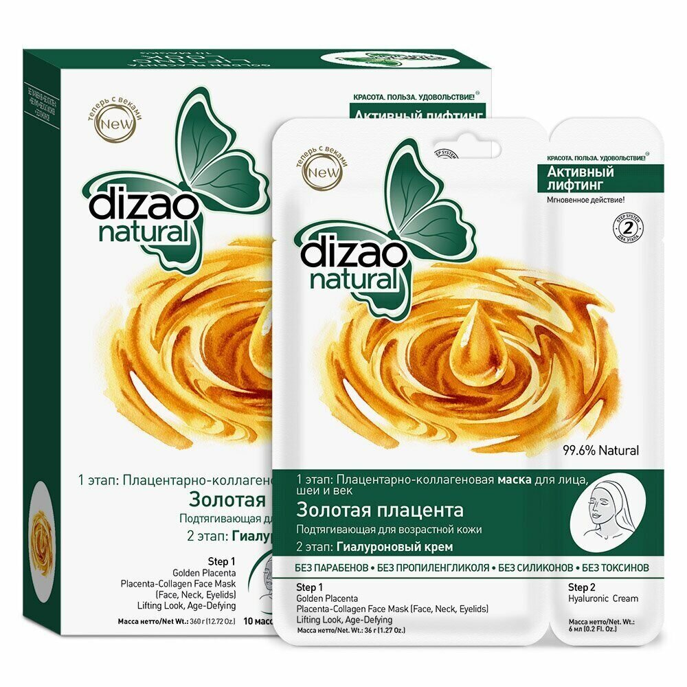 Маска Dizao (Дизао) для лица и шеи Плацентарно-коллагеновая Золотая плацента Активный лифтинг 10 шт.