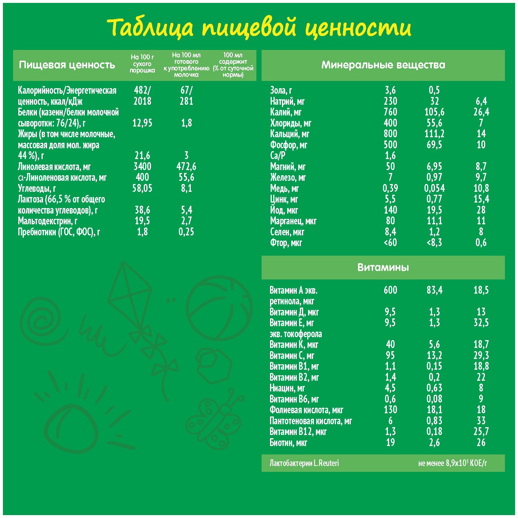 При разведении, все очень даже быстро и удобно. Хорошо разводится, без комочков. Вкус и запах очень приятный. Состав мне понравился, ничего лишнего. Есть лактобактерии, питательные вещества, различные микроэлементы, минералы и витамины. А ГЛАВНОЕ! Отсутствует пальмовое масло. |