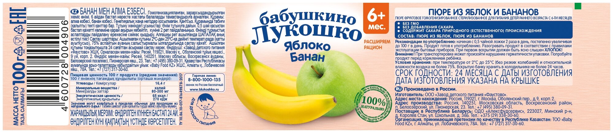 Купить Пюре Бабушкино Лукошко яблоко-банан, с 6 месяцев, стеклянная банка, 100 г, 6 шт.