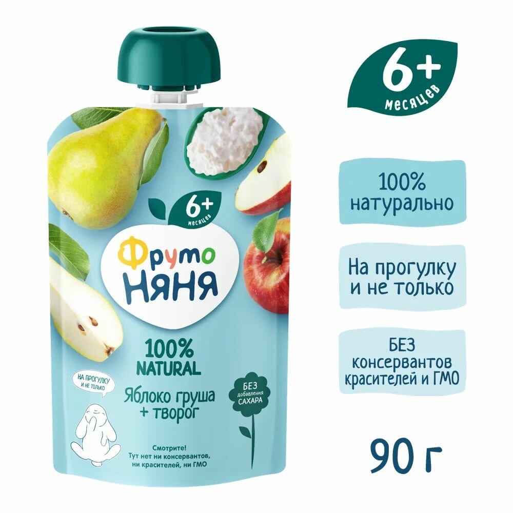 Пюре ФрутоНяня из яблок и груш с творогом, с 6 месяцев, мягкая упаковка, 90 г, 12 шт.