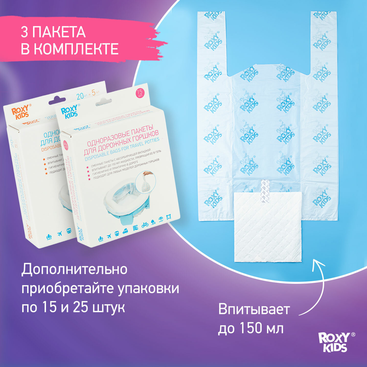 Горшок дорожный складной и насадка на унитаз HandyPotty от ROXY-KIDS с тремя пакетами, цвет фиолетовый