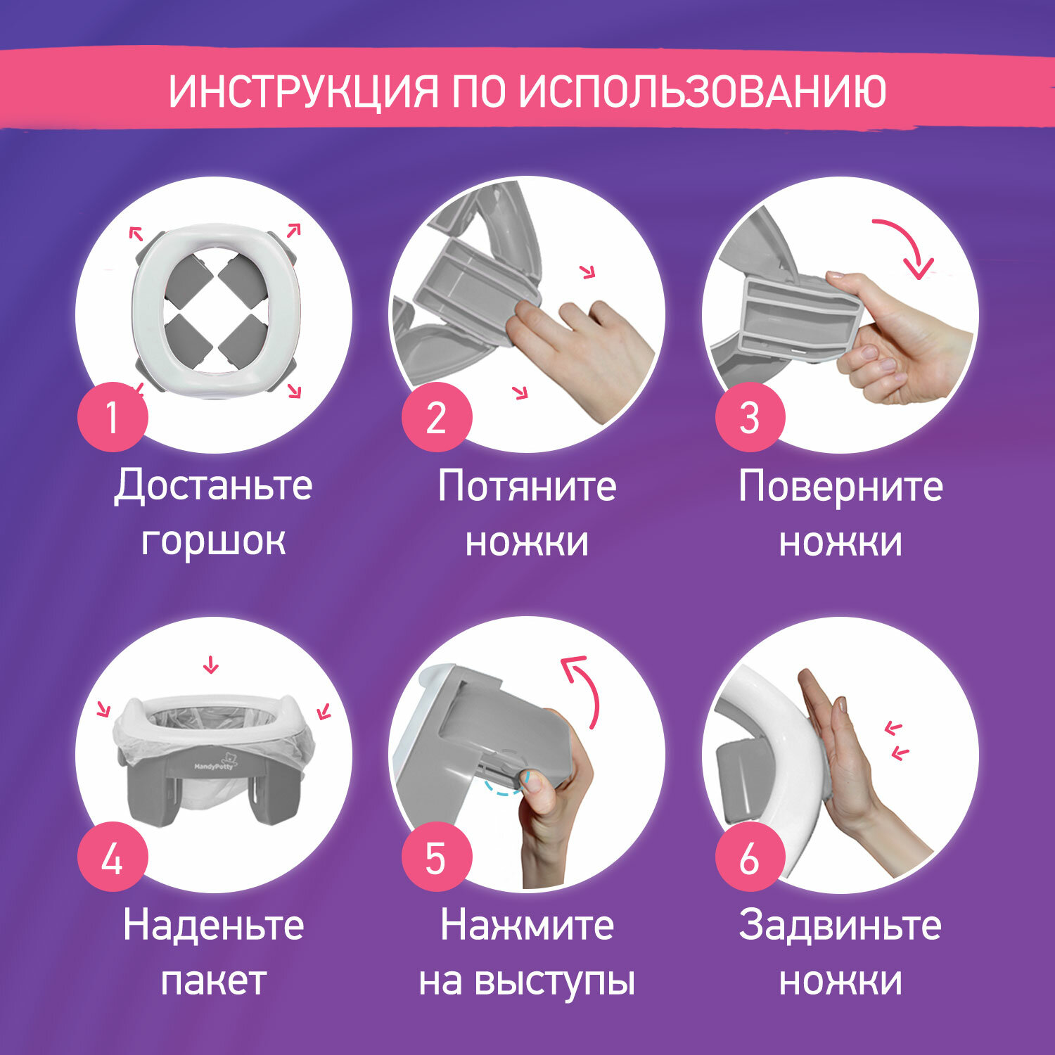 Горшок дорожный складной и насадка на унитаз Handy Potty от ROXY-KIDS с тремя пакетами, цвет фиолетовый