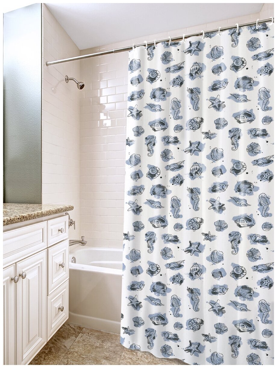 Штора для ванной комнаты VILINA водонепроницаемая с рисунком занавес с кольцами 180х180 см Ракушки белая