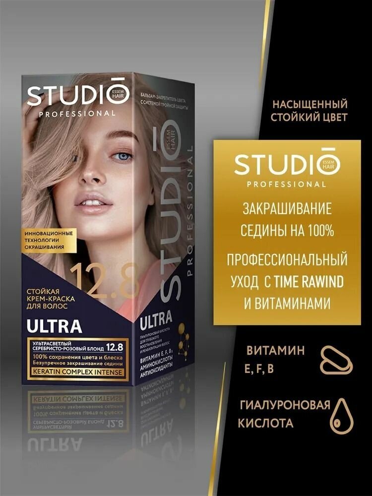 STUDIO professional Ultra стойкая краска для седых волос 12.8 Ультрасветлый серебристо-розовый блонд 115 мл