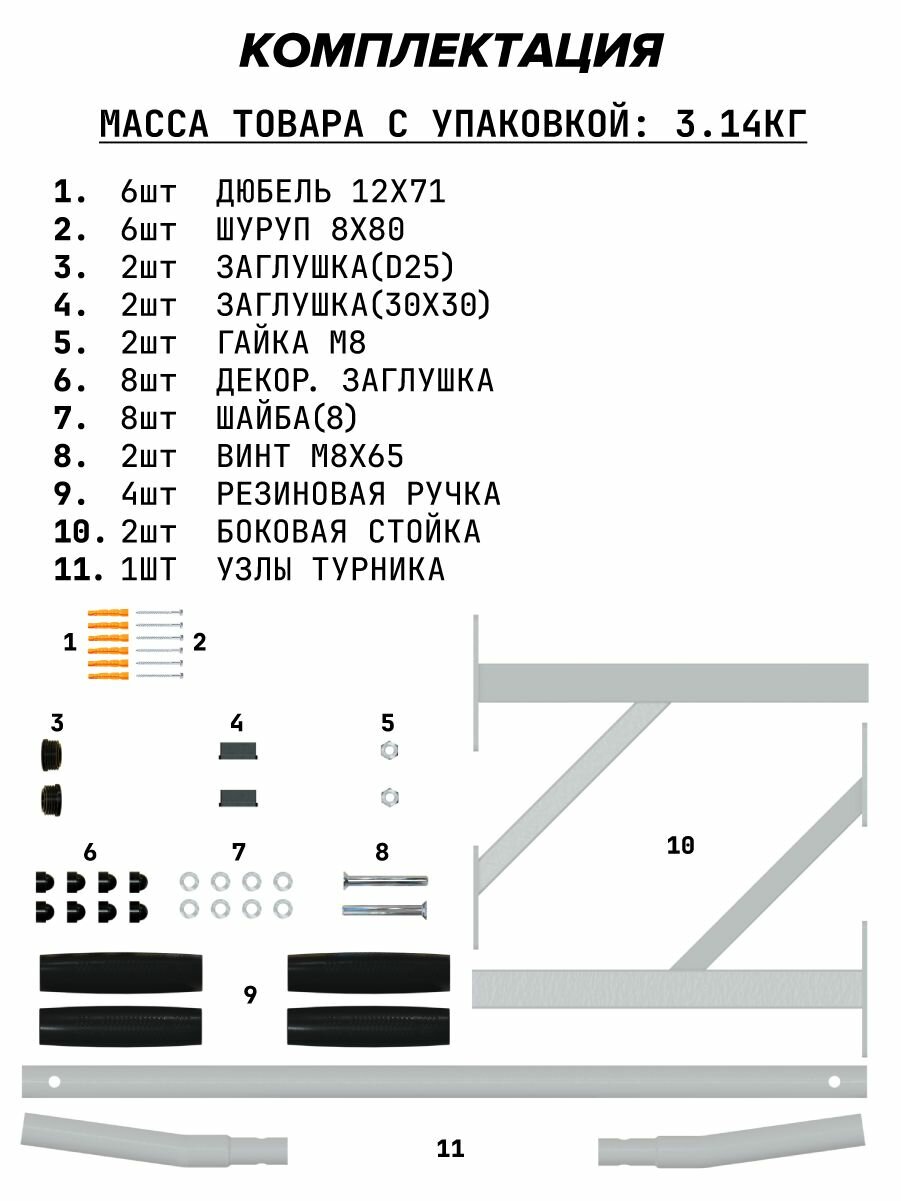 | Дополнительная информация | Комплектация: Узел турника-1шт; боковая стойка - 2шт, ручка турника - 4шт, заглушка круглая d25 - 2шт,; дюбель 12х71 - 6шт, шуруп 8х80 - 6шт, винт М8х65 - 2шт, шайба (8) - 8шт; гайка (8) - 2шт, колпачок декоративный - 8шт, заглушка 30х30 внутренняя - 2шт |