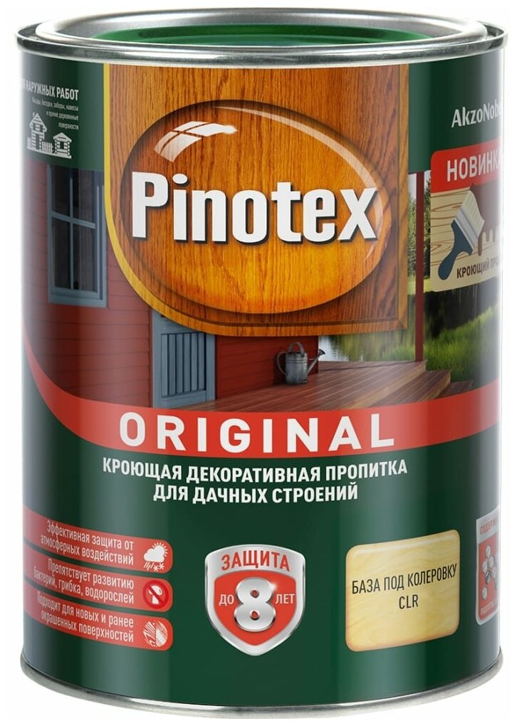 PINOTEX ORIGINAL пропитка декоративная кроющая для дачных строений и OSB, база CLR (8,4л)