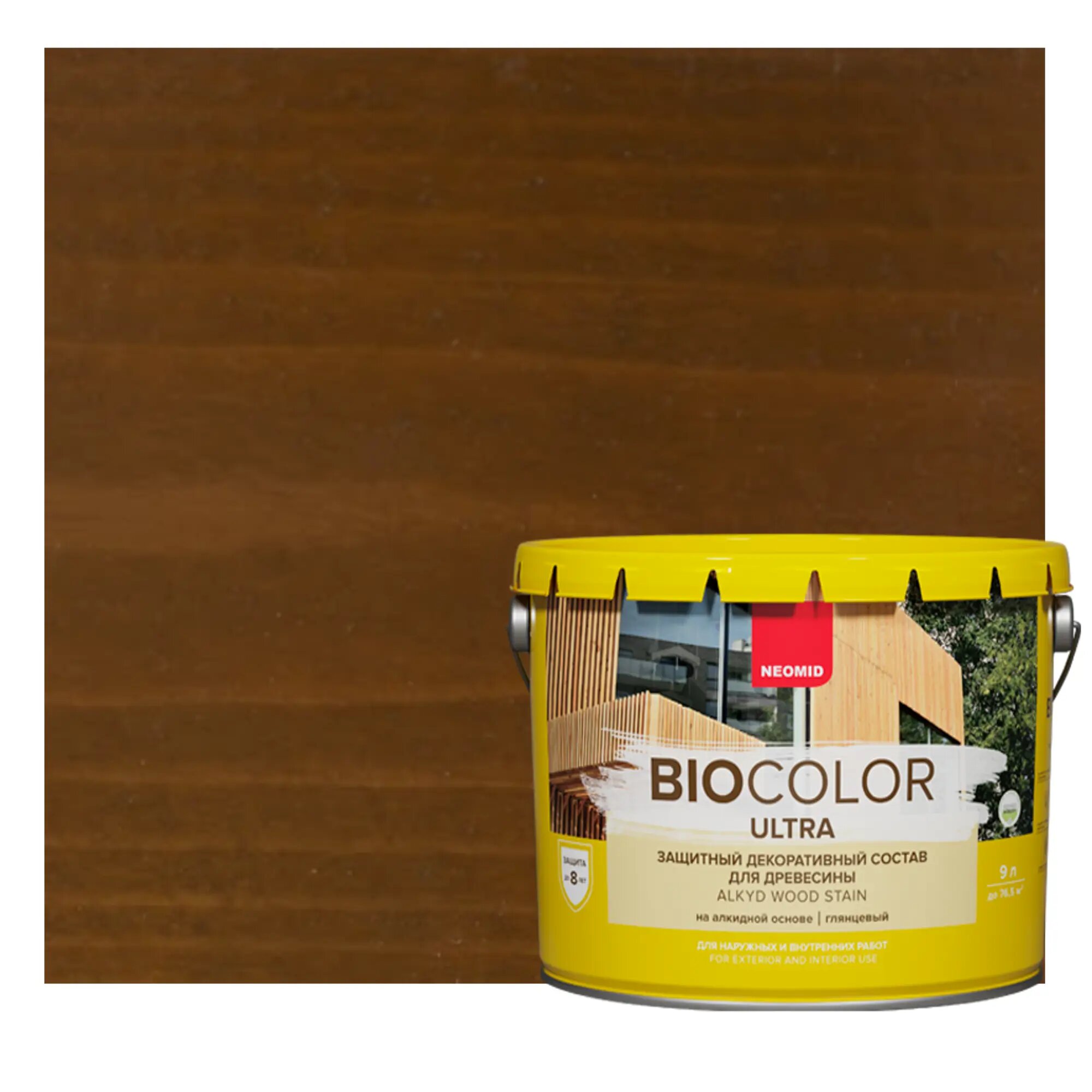 Декоративная Пропитка для Древесины Neomid Biocolor Ultra 9л Орех Полуглянцевая с Усиленной Защитой / Неомид Био Колор Ультра.
