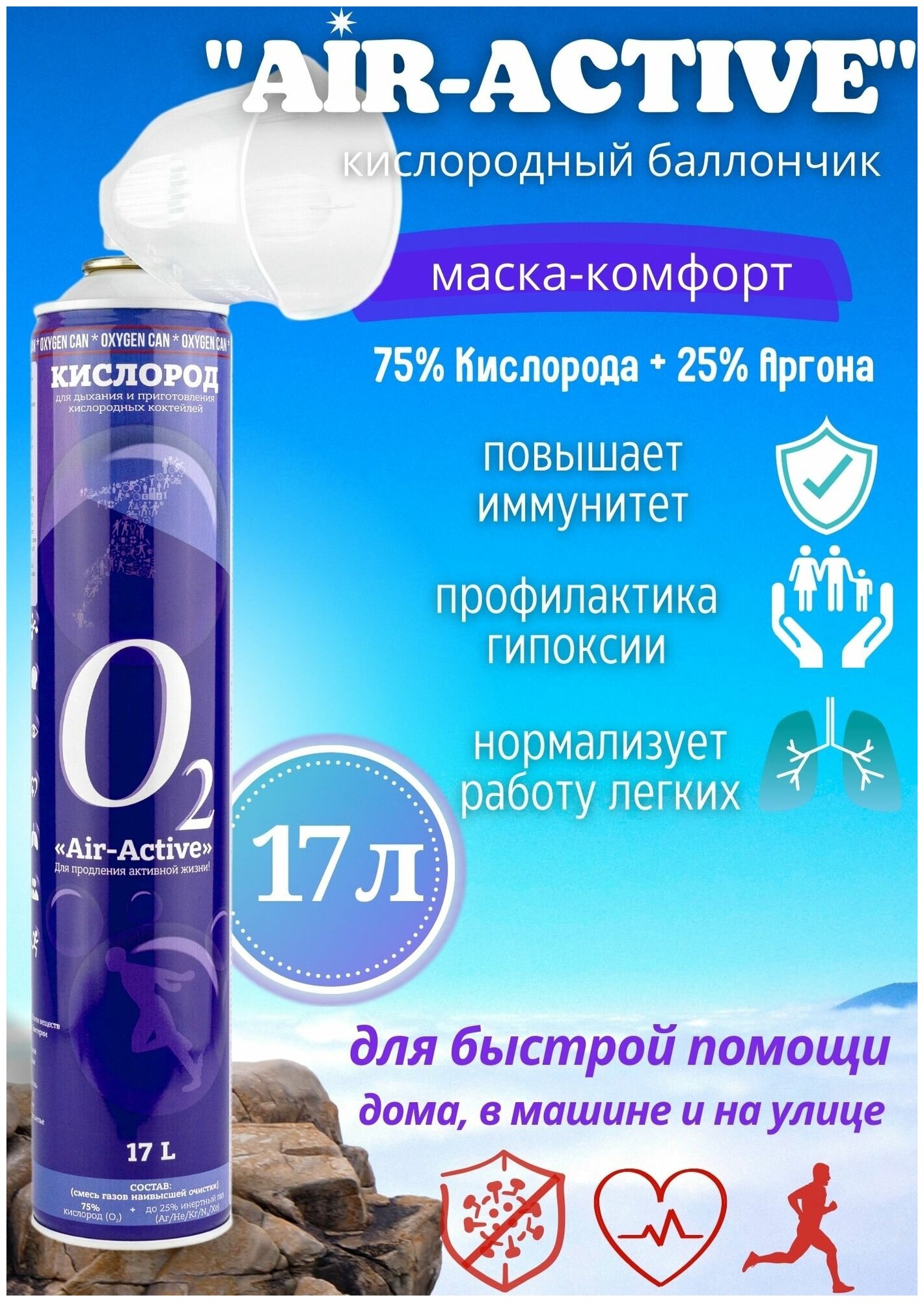 Купить Кислородный баллончик AIRACTIVE, 17л с аргоном + маска комфорт
