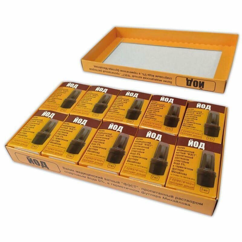 Йод, валик медицинский ватный «ФЭСТ», пропитанный раствором спиртовым йода 5%, в герметичном футляре Михайлова , 10 штук комплект, артикул 1890