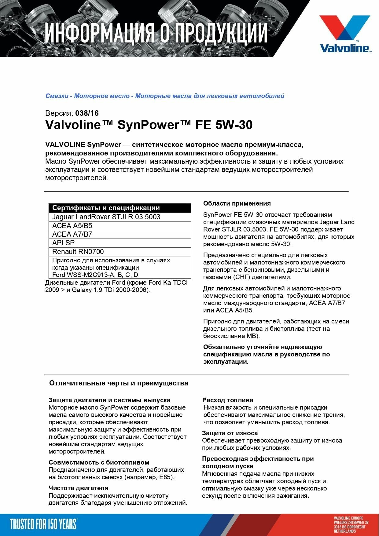 VALVOLINE 732273 Масо Valvoline SYNPOWER FE 5W30 5