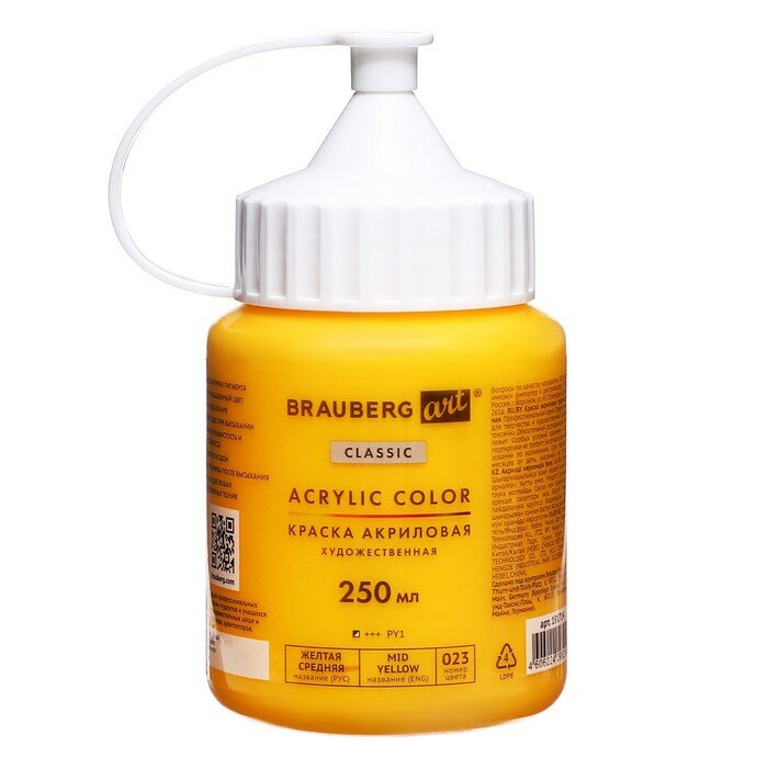 Краска акриловая художественная Brauberg Art Classic, флакон 250 мл, Желтая Средняя, 191714