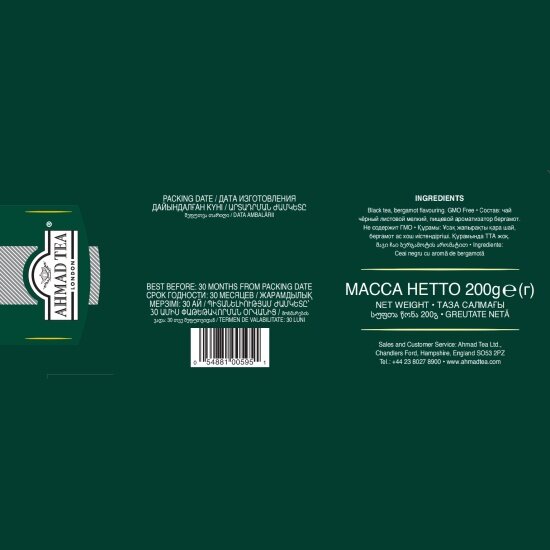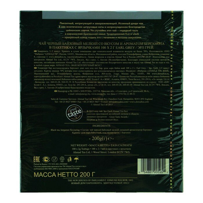 Чай AHMAD (Ахмад) "Earl Grey", черный с ароматом бергамота, 100 пакетиков с ярлычками по 2 г, 595i-08