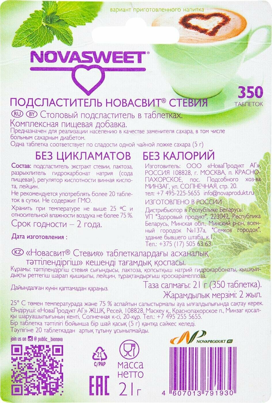 Novasweet Заменитель сахара в таблетках "Стевия", 350 таблеток
