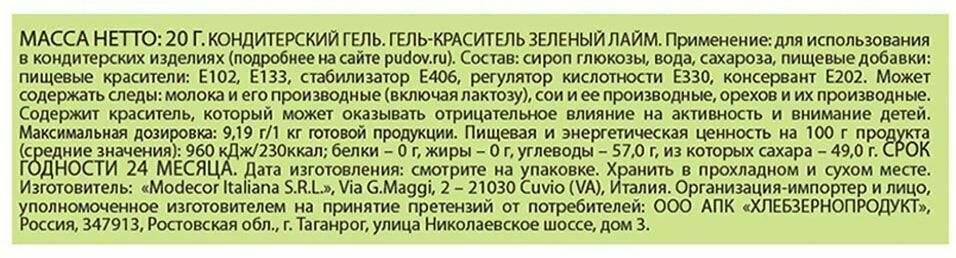 СохранитьГель-краситель пищевой EXTRA Зеленый лайм С.Пудовъ, Италия, 20 г интересное: