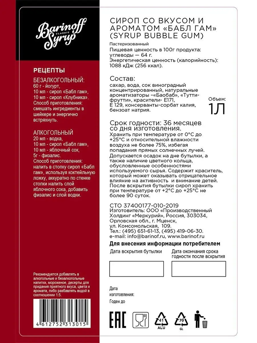 СохранитьСироп БАРinoff "Бабл Гам", 1 л интересное: