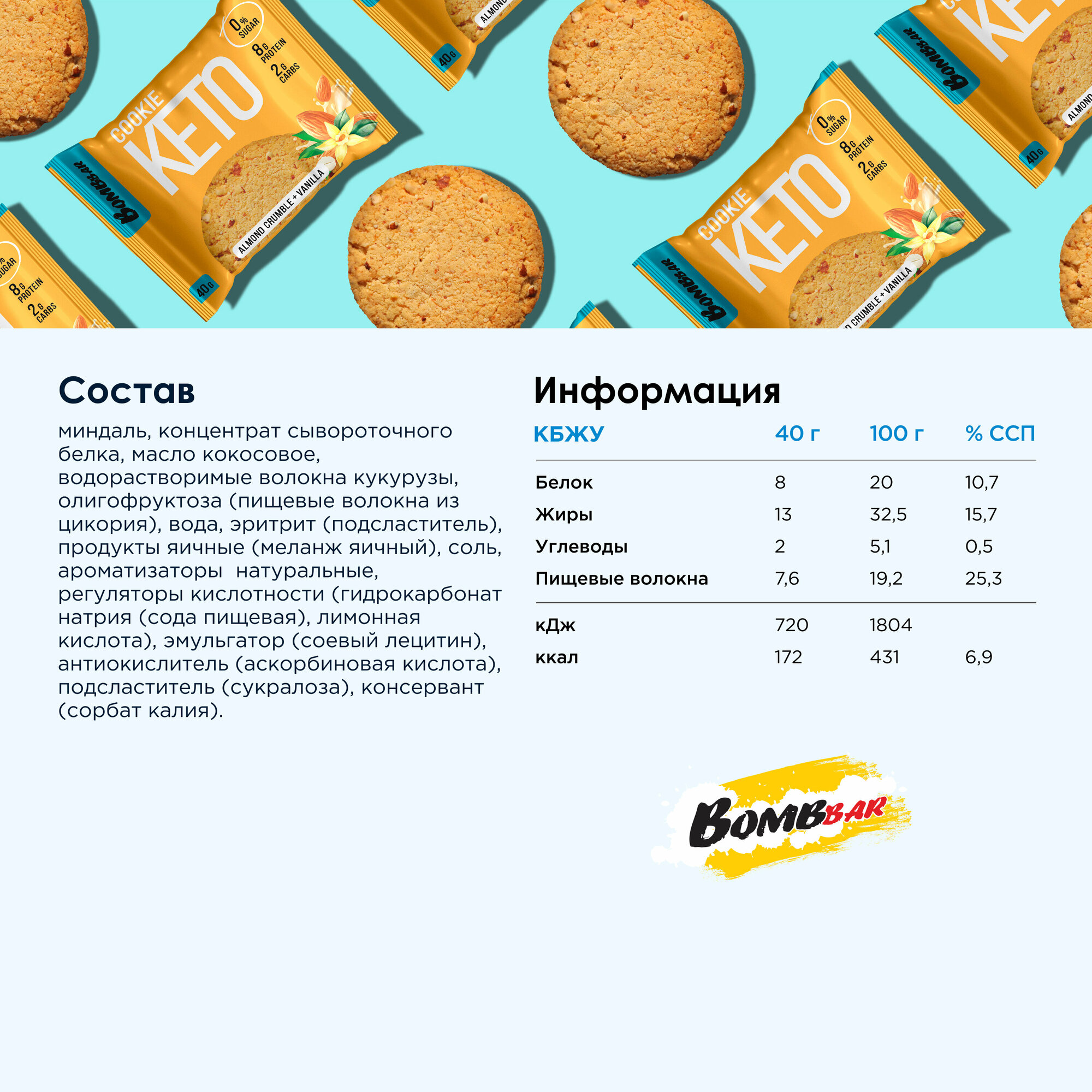 Диетическое печенье Bombbar KETO Cookie, 12шт по 40 г,вкус: миндальный крамбл-ваниль