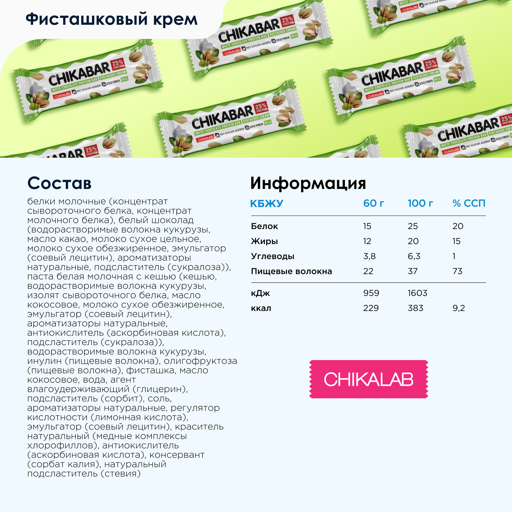 Протеиновый батончик CHIKALAB ChikaBar, Фисташковый крем (20шт по 60г)