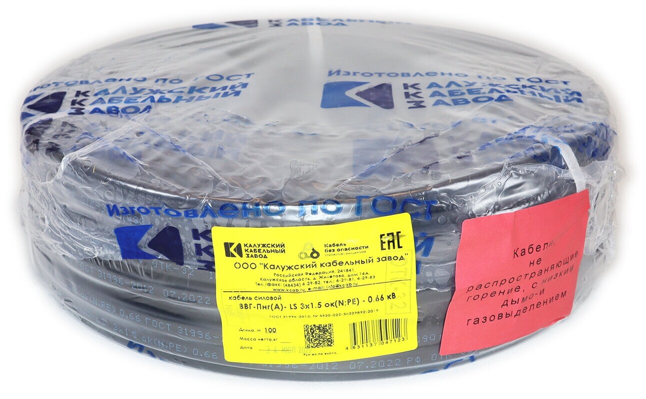 Кабель ВВГ-Пнг(А)-LS 3х1,5 ГОСТ, Калужский кабельный завод, 100 метров