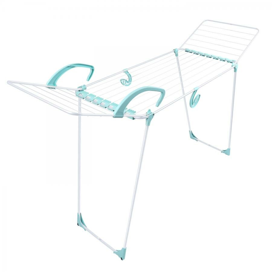Сушилка для белья напольная складная, серебряный, 3 зоны, до 15 кг. Пластмассовые наконечники на струнах обеспечивают дополнительную устойчивость и предотвращают скольжение белья