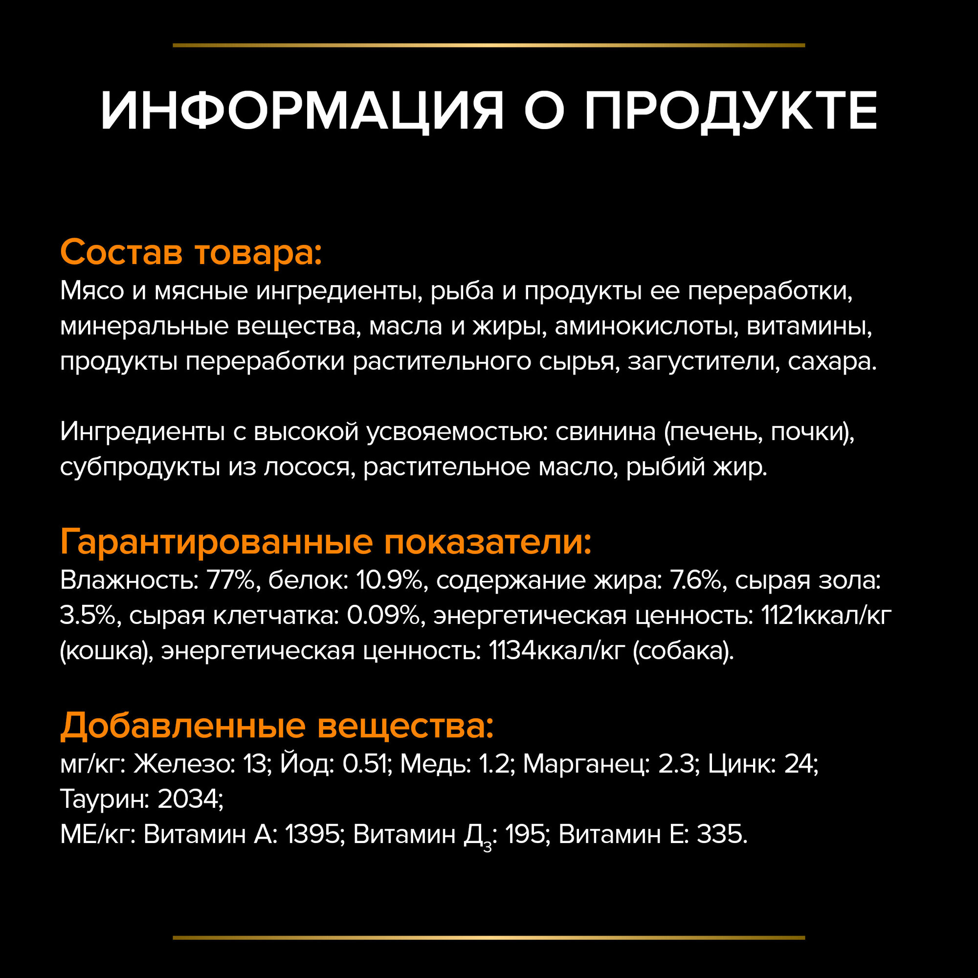 | Состав | мясо и продукты переработки мяса, рыба и продукты переработки рыбы, минеральные вещества, растительные масла и животные жиры, продукты переработки растительного сырья, консерванты, сахара, витамины; высокоусвояемые ингредиенты: почки, печень, лосось, подсолнечное масло и рыбий жир |