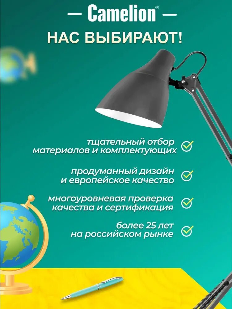 Лампа офисная Camelion KD-335 C09, E27, 40 Вт, серый