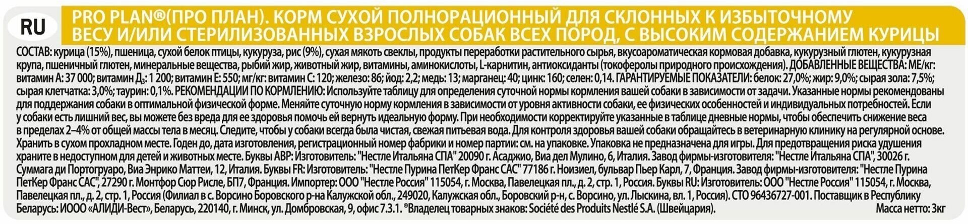 Сухой корм Pro Plan для склонных к избыточному весу и/или стерилизованных взрослых собак всех пород, с высоким содержанием курицы 3 кг