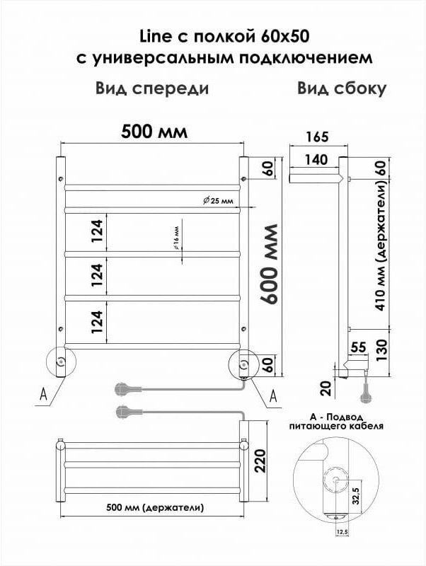 Полотенцесушитель INDIGO Line electro с полкой, 60/50 (скр.монтаж, унив.подкл.R/L, полиров.) LСLE60-50PR