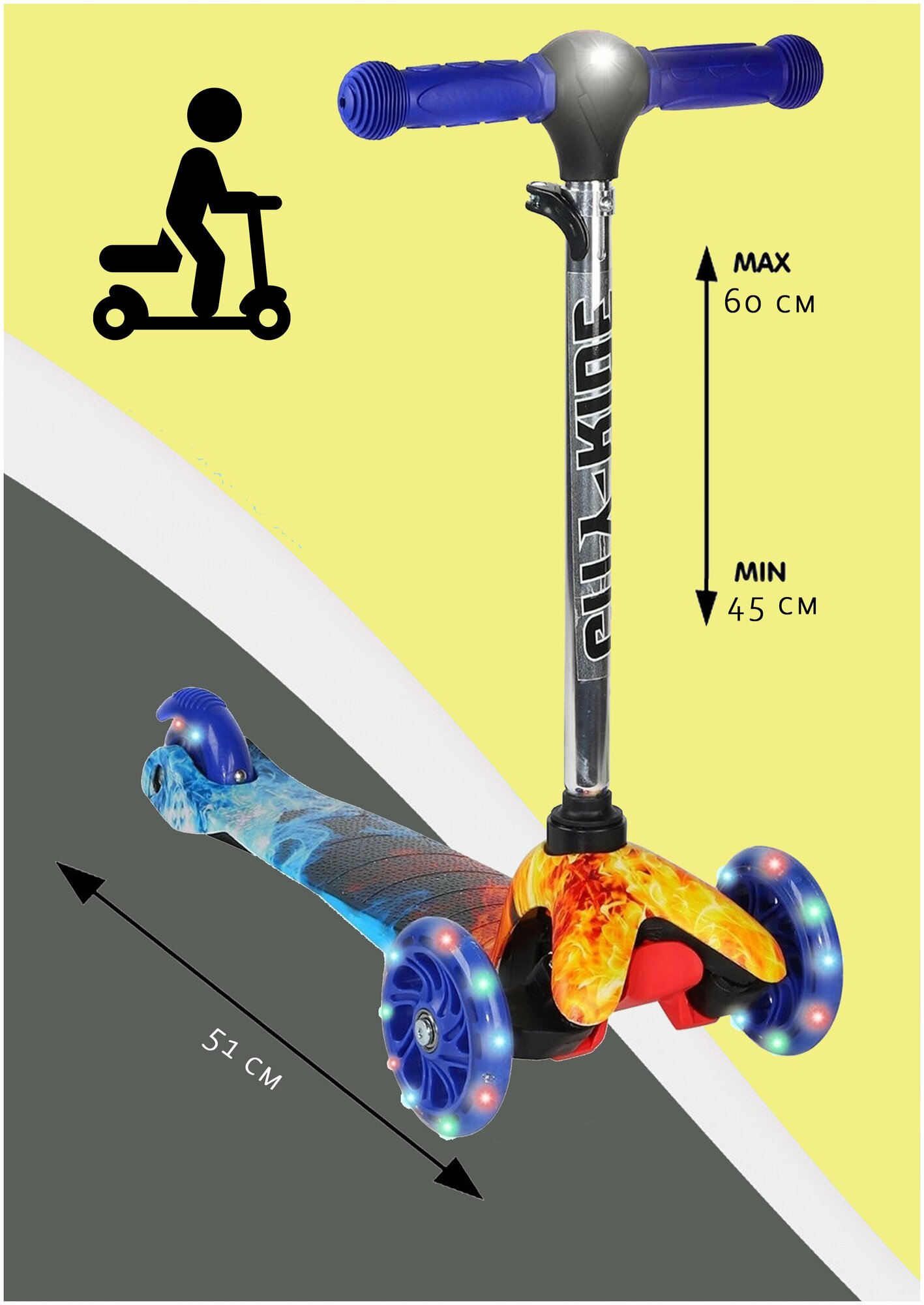 Самокат детский трехколесный ТМ CITY-RIDE, колеса PU 110/76, руль с фонариком телескопический, алюминиевый, резиновые рукоятки, цвет черный с огненной гидрографикой. Размеры: 55 х 21,5 х 66 см