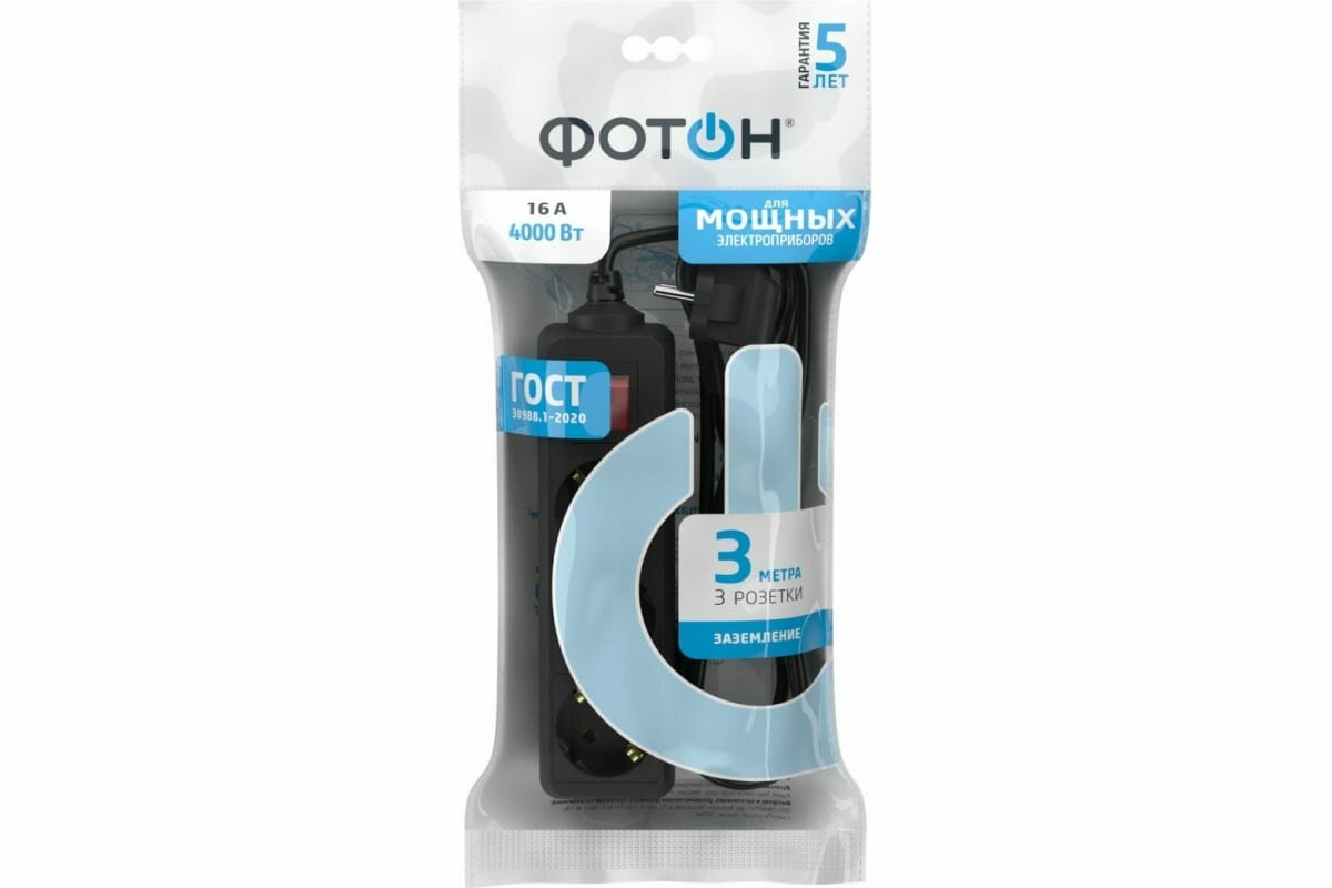 Удлинитель сетевой для розетки фотон 16А 3 метра 3 розетки с выключателем с заземлением черный, ГОСТ