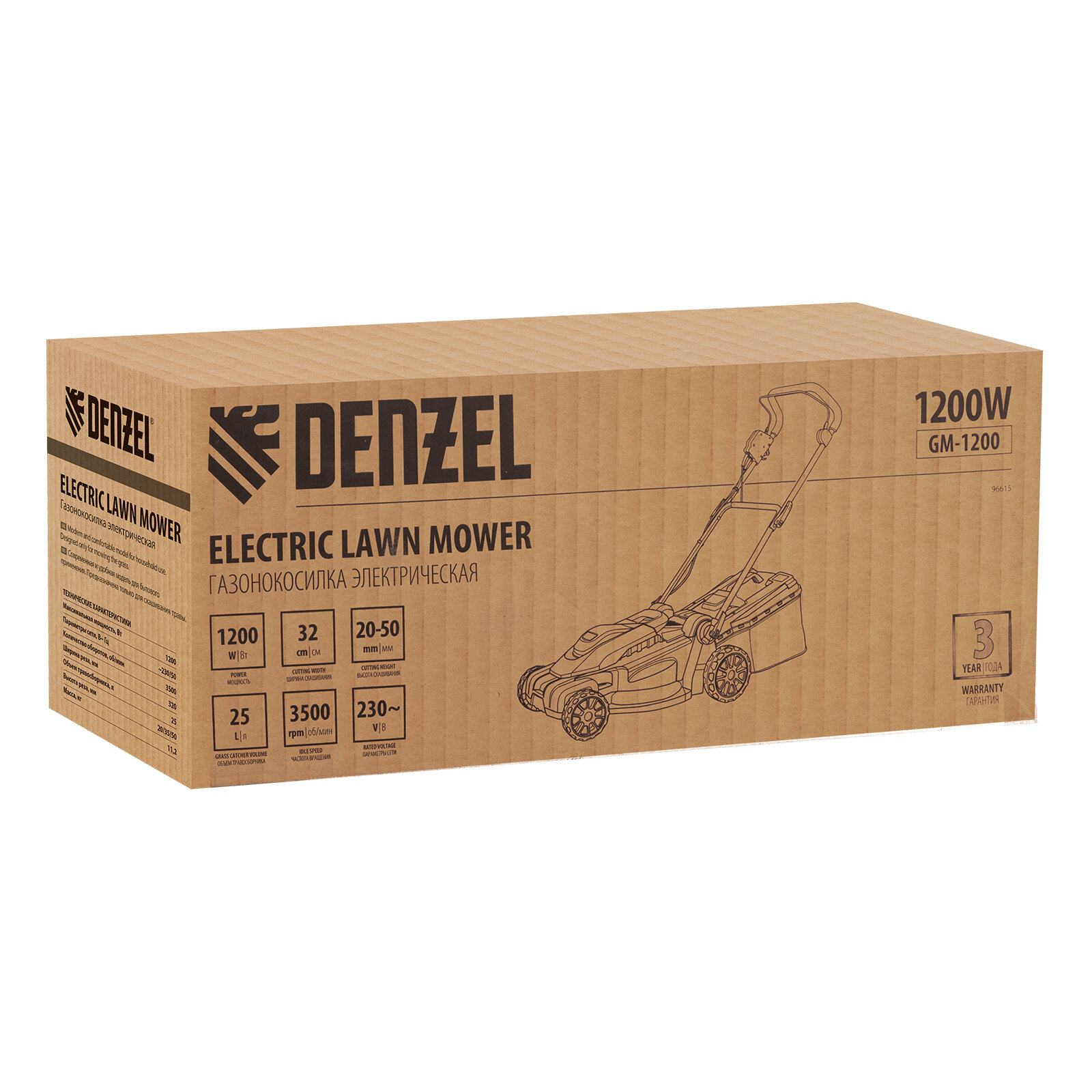 Купить Газонокосилка электрическая GM-1200, 1200 Вт, ширина 32 см, 3 уровня, травосборник 25 л. Denzel