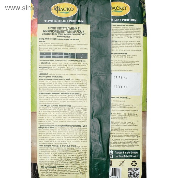 | Основные питательные вещества в мг/л, не менее | азот - 350; фосфор - 400; калий - 500; pH - 6-7 |