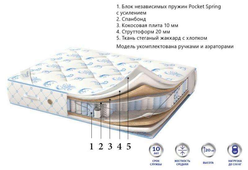 | Плюсы: | Матрас пружинный, качественный, прочный, прекрасно выдерживает большой вес, никаких вмятин и прогибания. |