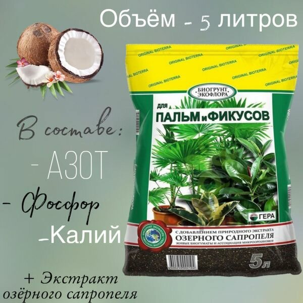 | Дополнительная информация | Биогрунт Гера для пальм и фикусов, 5 л, 1.3 кг |
